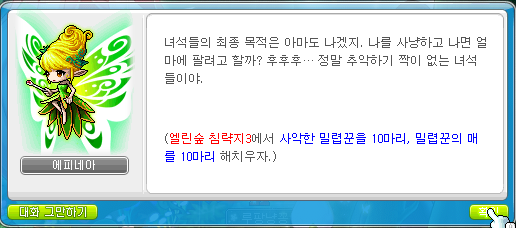 (엘린숲 침략지3에서 사악한 밀렵꾼을 10마리, 밀렵꾼의 매를 10마리 해치우자.)